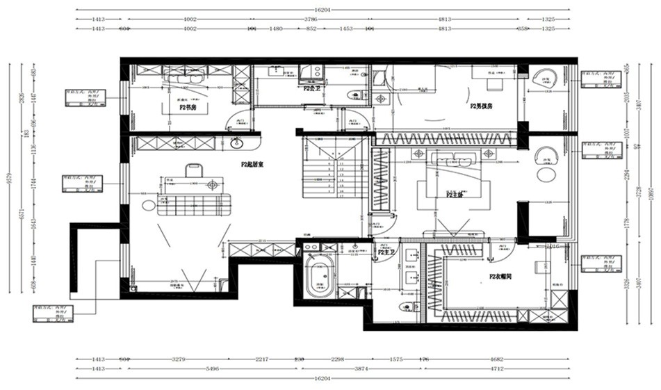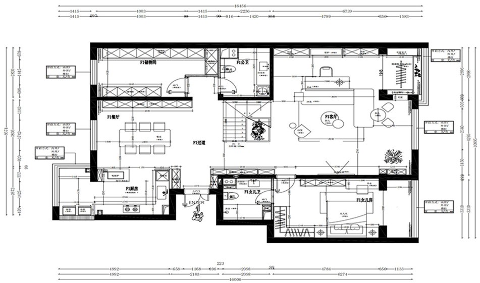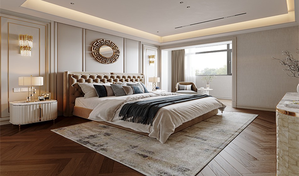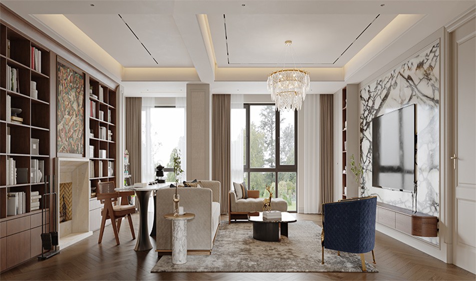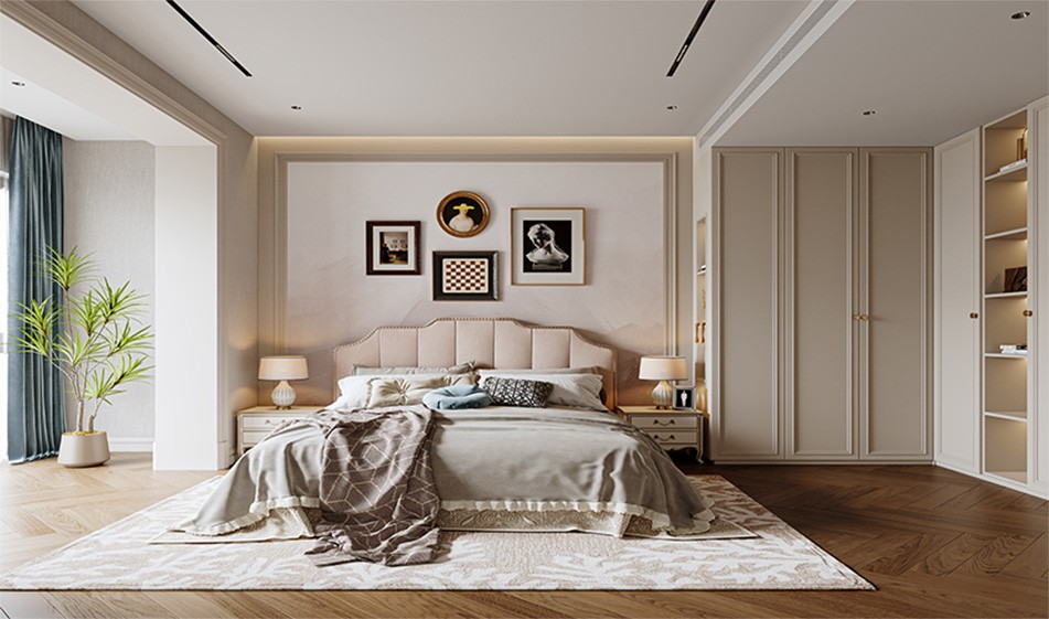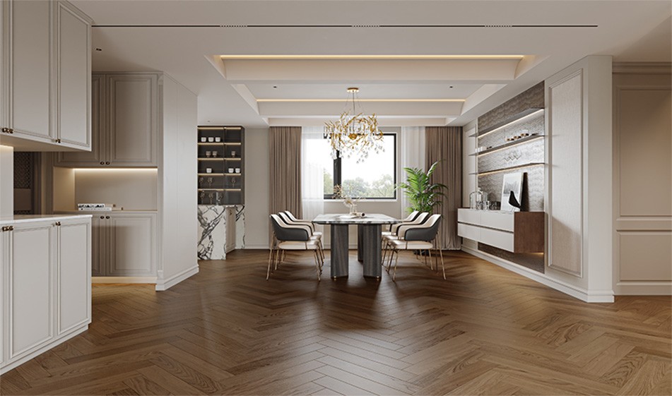本方案在布局上突出轴线的对称,豪华舒适的居住空间效果展现出贵族风格的高贵典雅。细节处理上运用了法式廊柱、雕花、线条,制作工艺精细考究。秉持典型的法式风格搭配原则,餐桌和餐椅均为米白色,表面略带雕花,配合扶手和椅腿的弧形曲度,显得优雅矜贵,而在白色的卷草纹窗帘、水晶吊灯、落地灯、瓶插百合花的搭配下,浪漫清新之感扑面而来。