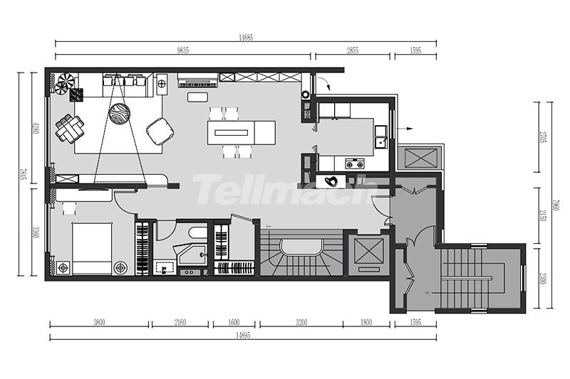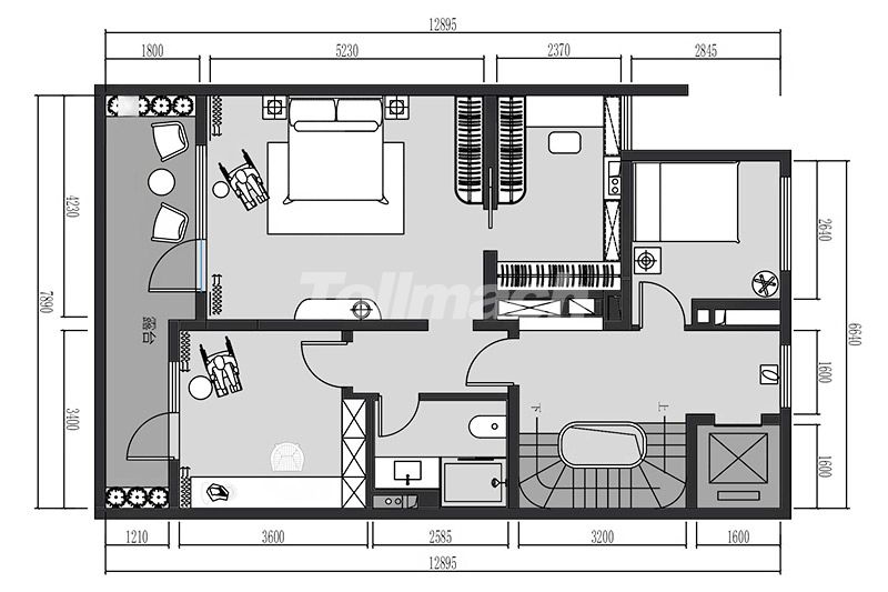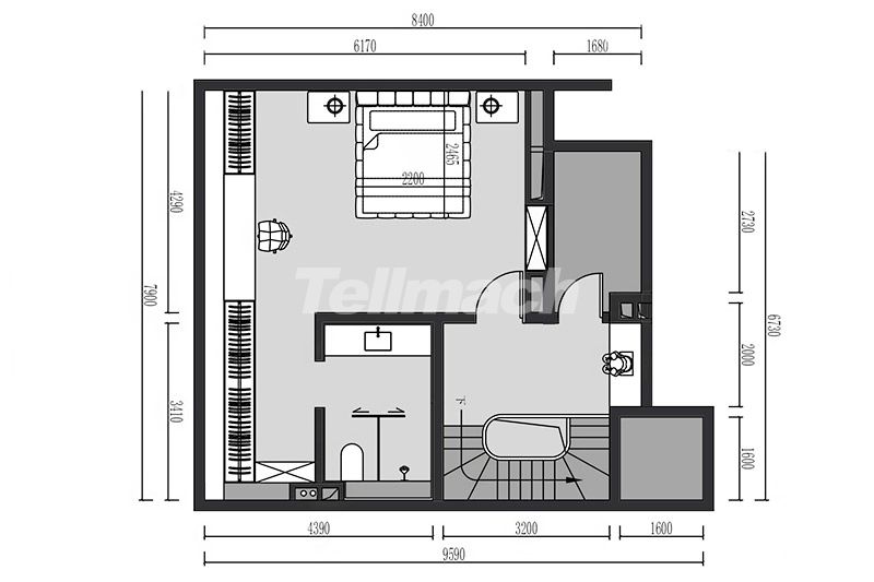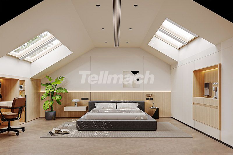阁楼憩区利用斜顶天窗引入自然光线,一体化柜体整合办公与收纳功能;深灰床体与浅木色形成柔和对比,艺术画与绿植点缀其间,让空间在极简框架中兼具办公效率与休憩舒适度。