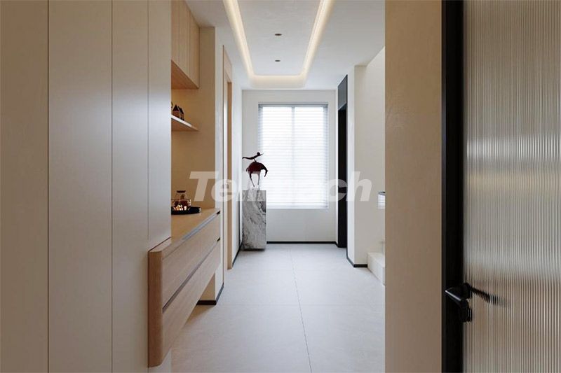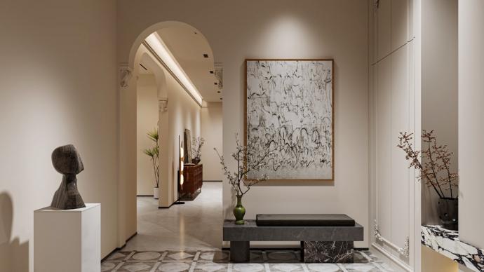 走廊以一体化柜体与悬浮置物台实现隐形收纳,大理石摆件与艺术雕塑提升精致感;暗藏灯与竖百叶帘柔化光线,浅暖色调与材质呼应让狭长空间更显通透,成为兼具过渡与展示功能的美学节点。