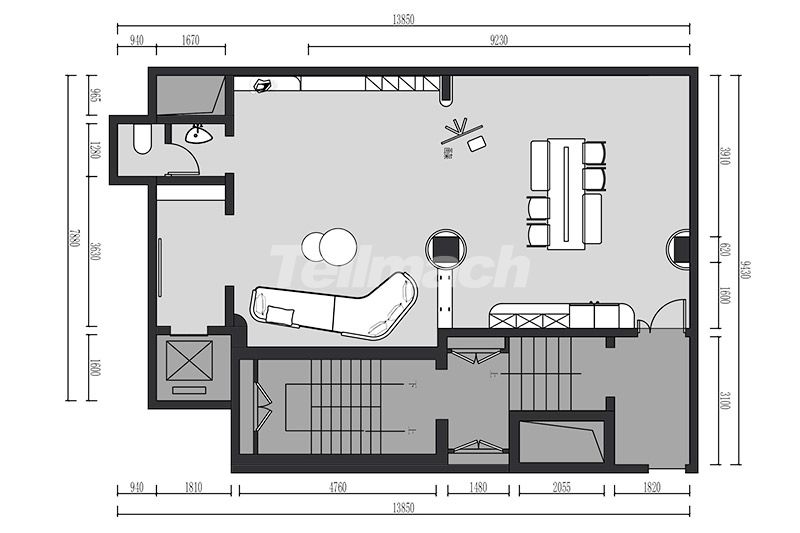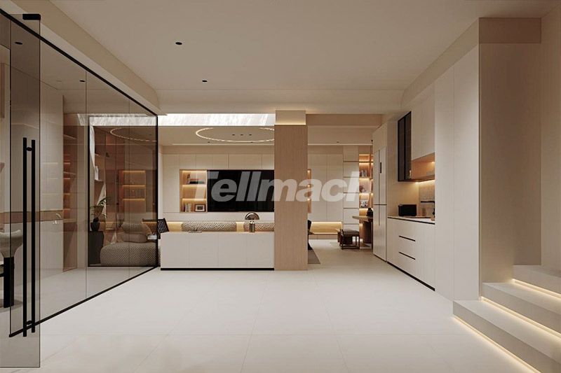 会客厅以玻璃隔断划分空间却不阻断视线,隐形收纳与悬浮柜体提升通透感;暗藏灯与柔光砖呼应,阶梯灯带强化动线层次,让开放空间在极简基调中兼具功能分区与视觉连贯性。