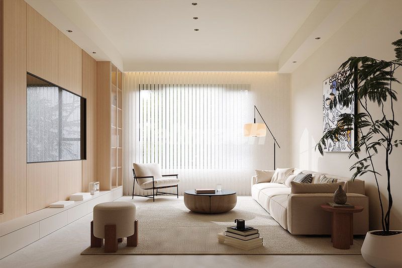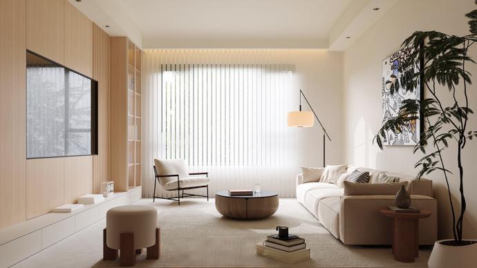 起居室以浅木色与奶白色为基底,隐形收纳柜弱化空间厚重感,竖百叶帘柔化光线;圆润家具与艺术挂画增添松弛感,散落的书籍、摆件让空间兼具极简美学与生活温度,适配日常休闲与轻社交场景。