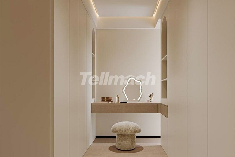 梳妆区以一体化柜体实现收纳与功能的融合,弧形灯光镜与蘑菇凳增添柔趣感;暗藏灯与浅暖色调呼应,侧边开放格既方便置物,又让狭窄空间更显通透,打造出精致且实用的私享美妆角落。
