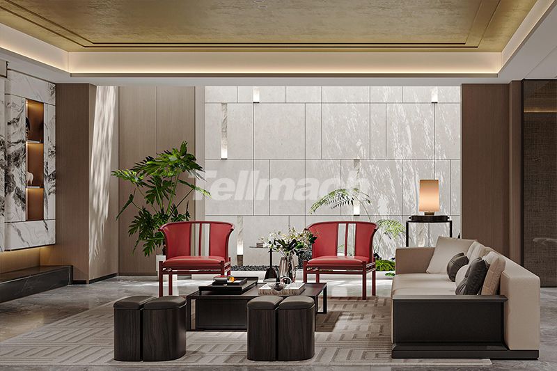 延续整体雅致基调,浅米色沙发与朱红座椅形成柔和对比,搭配简约茶几与矮凳,提升空间松弛感;背景墙的石材拼接与光影投射,结合绿植造景,让空间在现代简约中透出自然禅意,适配日常休闲与社交场景。