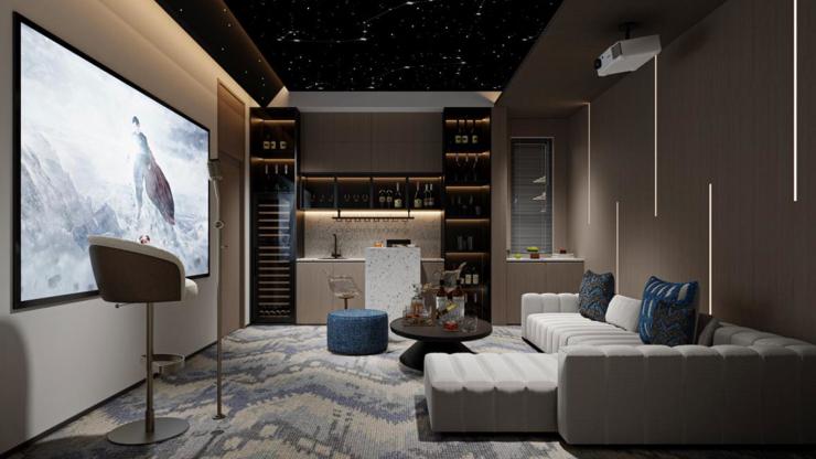 在整个户型中,以大面积深灰色铺垫调性,打造舒适惬意的空间特性。蓝色与金色结合...